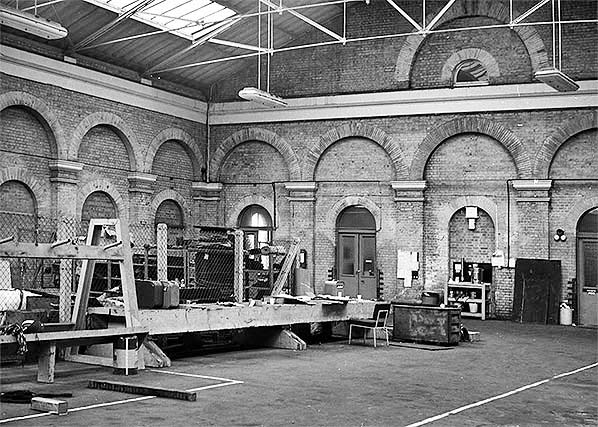 ![]() The interior of South Town station building sometime during the period BR rented the building out. This view is looking towards the forecourt but at the inner wall. The white lines would have been post railway and to segregate storage and movement areas although this does not appear to have been rigidly adhered to. Buffet facilities can be seen but accommodation and facilities appear basic! The doorway through which daylight can be seen led into the stationmaster's clerk's office, beyond which was the stationmaster's office. To the left of the 'daylight doorway' the first archway had been a door to and from the 1952 waiting and refreshment room while the next two bricked-up arches had contained windows. All three had been bricked-up at an unknown time, probably when the station became an unstaffed halt and space inside was rented out. The two doorways, right and centre, which retain their double doors had led from the booking hall to the concourse. The doorway on the right has a 'Private' sign on it; it was not original to this door for obvious reasons but may well have been a railway sign moved from elsewhere on the station.