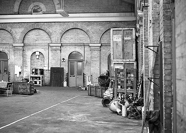 The interior of South Town station building sometime during the period BR rented the building out. This view is looking towards the forecourt but at the inner wall from the concourse. The arch which is home to a water heater had been a window in the rear of the original ticket office. It was bricked-up in 1952 when a modern, for the time, ticket office was constructed beyond the doorway largely obscured on the right. The spot where the water heater stands was once occupied by a tobacco kiosk. The suspended lighting was likely of railway origin, as was probably the 'Private' sign on the door although this door had been, pre-1952, one of the public doorways from the booking hall. The white lines were post railway and to segregate storage and movement areas although this does not appear to have been