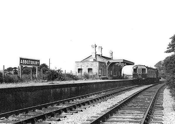 ![]() An auto-train stands in the platform at Abbotsbury station in 1950, two years before closure. By this time the rot had set in; the station lamps have all been removed leaving only the stands, and the flower beds are overgrown with weed. The station staff clearly no longer had any pride in their station.
