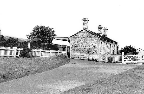 ![]() Abbotsbury station seen from the access road in 1952; an auto-train stands in the platform. The entrance to the goods yard is through the white gate on the right.