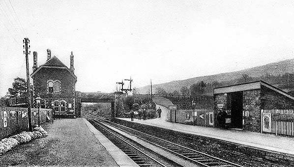 ![]() Abercanaid station looking south along the up platform c1908. Entrance to the station is from the bridge where an entrance porch gives access to the upper floor of the station building. There was a wide ramp for access to the down platform. Th station was provided with gas lighting from opening.