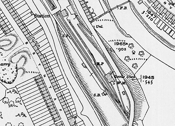 1899 1:2,500 OS map shows the layout of Aberfan station and goods yard as built. The station entrance is just visible adjacent to the bridge on the upper floor of the north west corner of the building. Passengers would go down stairs and out through an arch in the south east corner. A wide ramp leads to the down platform. A signal box south of the down platforms stands opposite the entrance to the goods yard. The yard comprises a loop with one side running through the goods shed and a short head shunt off one side of the loop. Beyond the loop, a long siding, probably for coal, runs diagonally across the yard to terminate north of the station building. From this siding a reversal gives access to another siding running under a canopy behind the good shed. Road access to the yard is along a steep drive up from Aberfan Crescent.
