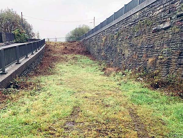 ![]() Looking south east at the siote of Aberfan station in September 2022. The bridge has gone but the hairpin bend remains. The only evidence of the station is the ramp down to the down platform. This has been retained as pedestrian access to Railway Close.