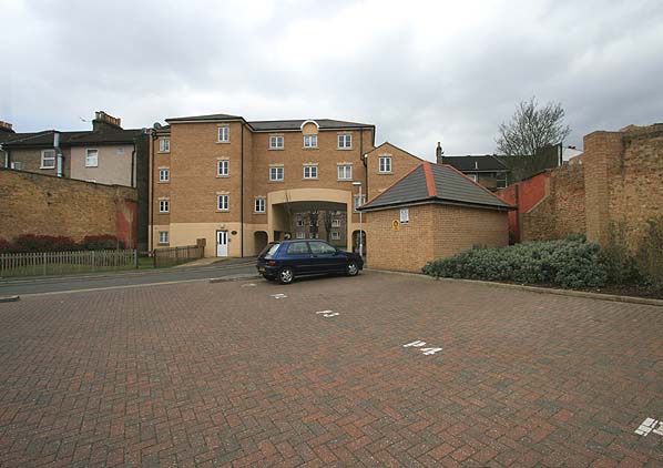 The site of Addiscombe Station building in March 2007. Some (red) brickwork from the station building can be seen on both sides. The retaining walls are also of railway origin.