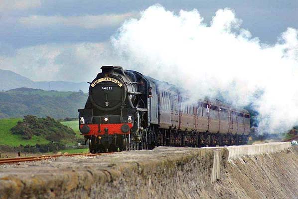 The ‘Cambrian Rail Tour’ approaches Afon Wen station in the summer of 2007. At the head of the train was locomotive No. 44871. It was built in March 1945 at Crewe works for the LMS. One of the very successful Stanier Black Fives, it lasted to the end of steam. When it was withdrawn from 10A, Carnforth shed, in August 1968 it had just hauled a leg of 1T57, the ‘Fifteen Guinea Special’ double-heading with classmate 44781. The ‘Fifteen Guinea Special’ was the last steam-hauled standard gauge train run by British Railways. No. 44871 was lucky enough to be sold on to preservation.