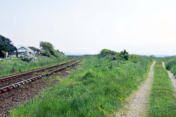Station Name: AFON WENLooking east at the site of Afon Wen station on 25 May 2012. Directly in front of the photographer are the degraded remains of platform 1. Passing behind the platforms to the right is a trackway which follows the course of the sidings. The degraded remains of the island platform are to the left of the railway line. Photo by Paul Wright Home Page