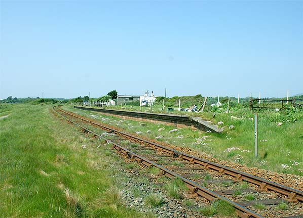 Station Name: AFON WENLooking west at the site of Afon Wen station on 25 May 2012 from the eastern end of the station site. To the right is the eastern end of the island platform which was extended in the winter of 1947. The railway track which is still in use was formerly the down main line. In May 2012 it was a bi-directional single-track, part of the Cambrian line between Dovey Junction and Pwllheli. Photo by Paul Wright Home Page