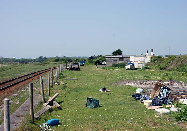 ![]() Station Name: AFON WENLooking west along the island platform at Afon Wen station on 25 May 2012. The station refreshment room would have been at a point inbetween the trailer and the boat. The platform to the left had been platform 2 which served the up main line. Platform 1 which had served the down main line was adjacent to the line which can be seen to the left. Photo by Paul Wright ![]()