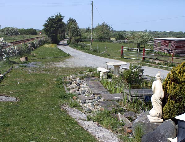 Station Name: AFON WENLooking west from the platform ramp of Afon Wen station’s island platform towards Pwllheli on 25 May 2012. The platform edge stones of platform 3 can be seen in the centre of the picture adjacent to the pond. The platform end had been incorporated into the garden of the former stationmaster's house. Photo by Les Fifoot Home Page