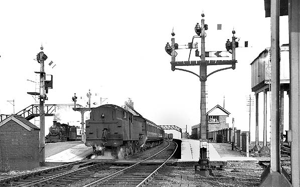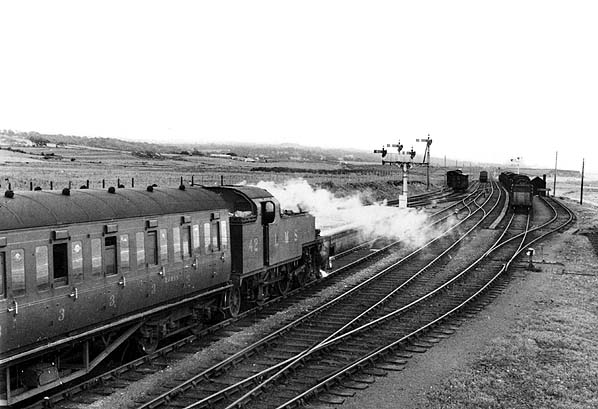 ![]() Looking east from the footbridge that linked Afon Wen platforms 1 and 2 in July 1941. An LMS service from Bangor had just arrived and is seen standing at platform 2. At the head of the train is LMS locomotive No. 42 which entered service on 2 June 1931. Built to a Fowler design at Derby Works, this class 3, 2-6-2 tank was renumbered 40042 at nationalisation when it was allocated to 3C, Rycroft (Walsall) shed until transfer in June 1951 to 1A, Willseden shed from where it was withdrawn on 22 June 1961 and scrapped in July 1962 at Crewe works.