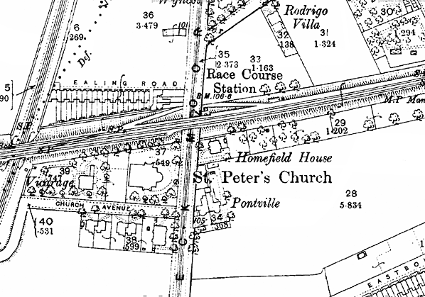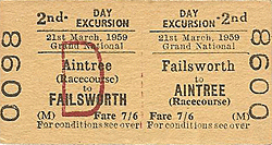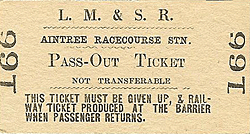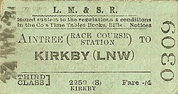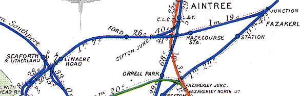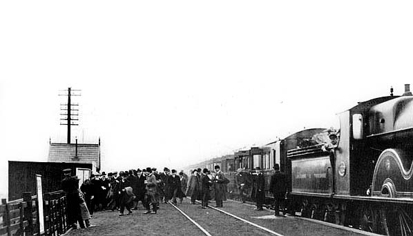 ![]() On 8 November 1912 a Race Day special of the Lancashire & Yorkshire Railway stands at Aintree Racecourse station. The picture is looking east and the train is standing on what would have normally been the westbound track of the North Mersey branch. The eastbound track can be seen running along the platform which was constructed from a timber facing backfilled with cinders. The eastbound track was raised up through the station site so it could run along the platform. On race days the eastbound line was taken out of use and the westbound became bi-directional. Trains would have arrived almost in convoy all of them heading west. They would then have gone onto the Aintree Gridiron for servicing. After the Grand National was over they would pick up passengers from the station heading east.