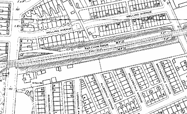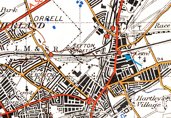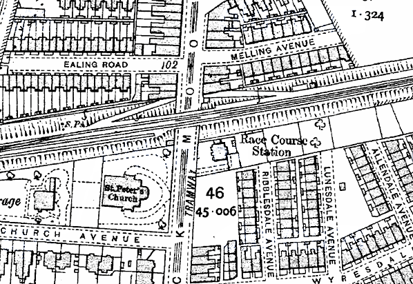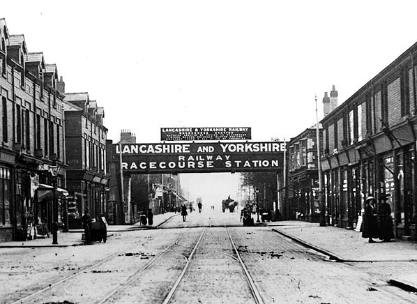 ![]() Looking south along Warbreck Moor in the early 20th Century towards Aintree Racecourse station. The single platform of the station was to the left of the bridge on the east side of the road. Access ramps and steps led up to the station from both sides of the Warbreck Moor.