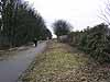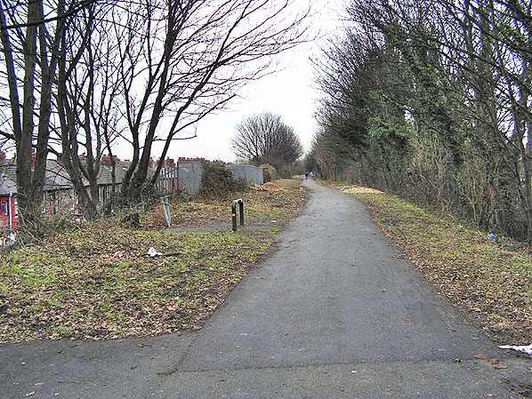 Photo by Martin Brown ![]() ![]() Aintree Racecourse station looking east from the Warbreck Moor bridge in January 2011. The station had only a single platform which was located to the left of the path. The metal fence marks the rear of the platform. The platform was unusual in that it was actually the eastbound track of the North Mersey Branch raised up above the level of the westbound. The track was then topped off with cinders so that it could be used as a platform. It was not used as a running line when the station was open for excursions.