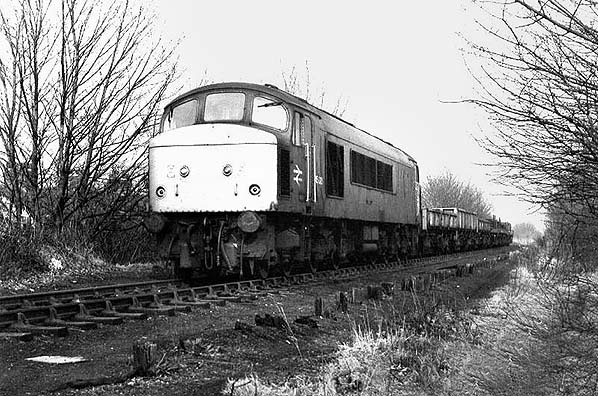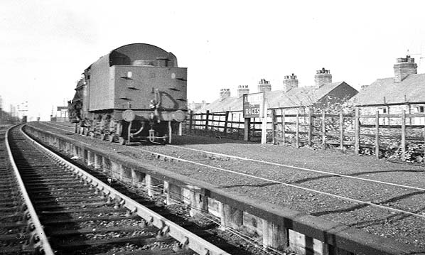 Photo by Jon Hughes ![]() On 10th of March 1985 a Class 45 locomotive number 45 006 can be seen heading west through Aintree Racecourse station on an engineers train. The train was travelling along the site of the station's single platform. To the right of the train the wooden supports from the platform can be seen. By 1985 the line had been singled and the former eastbound track (the one that ran along the platform) had become bi-directional. When the station was open the eastbound track was covered up to the top of the rail with cinders which formed the platform.