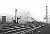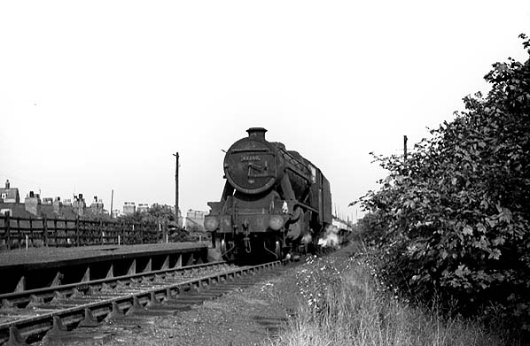 Photo from John Mann collection ![]() Aintree Racecourse station looking west on 22 October 1963. Heading east along the platform is Stanier 5MT (Black 5) locomotive number 44822. Photo courtesy of David Bryant and John Bannon from their Steam on Merseyside & Beyond book. ![]() Looking east at Aintree Racecourse station in 1965 as an ex LMS 8F locomotive heads west with a goods service. The station's single platform that had a railway line running along it, for eastbound traffic, can be seen to the left. One of the rails from the eastbound line can be made out in the picture running along the platform. When the station was in use, which was only ever on race days, the westbound line became bi-directional.