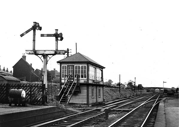 ![]() Looking west from the western end of Aldridge station in 1951. The Brownhills branch junction is seen adjacent to the timber MR signal box which controlled it. Copyright photo from the John Alsop collection ![]()