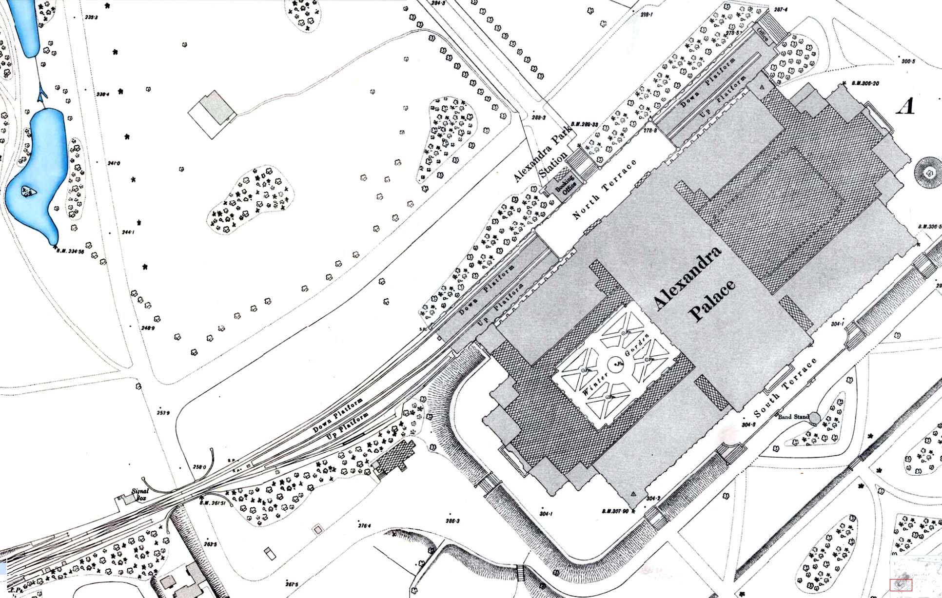 ![]() 1893 1:1,056 OS Town Plan shows the layout of the station as built. It had two facing platforms with a third line serving the south of the up platform face terminating part way along in; there was also a short siding parallel to this line. Alexandra Palace never handled goods traffic other than coal for the Palace and this was the only siding. Rather than having a canopy, the central section of the platform was protected from the weather by a wide terrace in front of the north-west frontage of the Palace. Station offices were sited at the east end of the platforms adjacent to a wide stairway up to the road. The booking office, with a canopy in front of the right top side of the building, is seen to the left of the steps up to the North Terrace. The station signal box is seen to the west of the station on the down side.