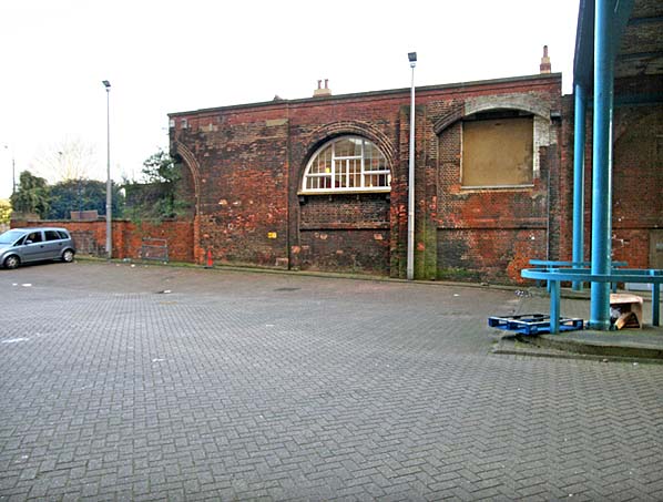 Alexandra Palace station in April 2007. The position of the footbridge is still clearly visible on at the rear of the station building.