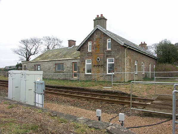 Allanfearn Station in March 2007. The position of the station clock is clearly visible on the right side of the building between the windows.