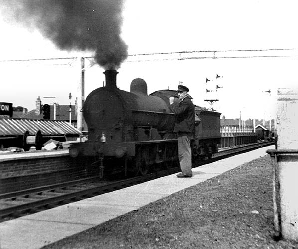 The northwestern end of Allerton station in the late 1950s during the period when electrification of the line between Liverpool and Crewe was underway. The locomotive was heading towards Liverpool and had probably come off Speke Shed which lay to the southeast of the station. 49437 was built in 1922 by the LNWR at Crewe Works to a design by H.P.M.Beams. Classified G2, these locos were known as 'Super Ds' or 'Duck Eights' and worked mainly freights. This loco was withdrawn in September,