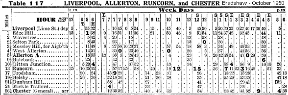 Passenger services settled down into a pattern of local stopping trains running between Liverpool Lime Street and Crewe, Manchester Oxford Road (via Warrington Arpley), Chester and Garston Dock. Apart from the loss of the Garston Dock service in 1947 very little changed until the late 1950's.