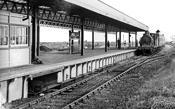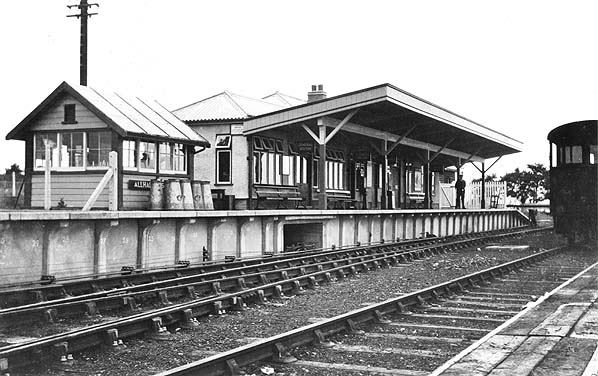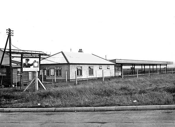 The station at Allhallows was sited 400yd from the beach and comprised a single concrete platform. The rectangular single-storey building at the north end and parallel to the platform was also concrete with a hipped asbestos roof. At the south end of the building there was a short narrower extension with a slightly lower hipped roof. An upward sloping canopy, favoured by the SR at this time, with a plain valance supported by timber columns stretched the width of the platform in front of the building. The entrance to the booking office was at the north end of the building.