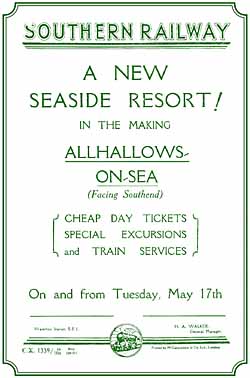 An article published in April 1932 in Southern Railway Magazine indicated the SR's aspirations for the line: ‘near the small village of Allhallows, amid fields where cattle graze and the ploughman walks his furrow, workmen are busy constructing roads and laying the main drains and conduits for the gas, water, telephone and electric light services to houses of which not a brick has yet been laid. In contrast to the urban development of an earlier day, the prospective house-purchaser (and season-ticket holder) at Allhallows will approach his future home from a modern reinforced concrete carriageway, instead of stumbling through the ruts of an unmade road.’