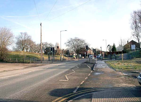 ![]() Looking east along Atherton Road. The railway crossed the road on a bridge, close to where the traffic lights were located. The most likely location of the station is thought to be on the embankment, to the right hand side of the traffic lights.