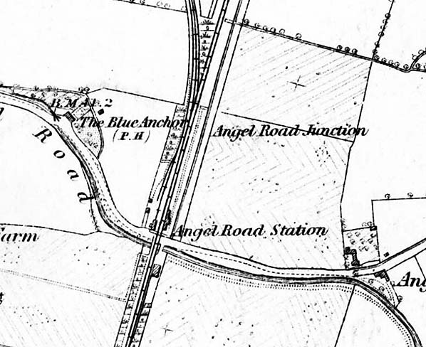 With the opening of the Enfield Town branch on 1.3.1849 the station became a junction and was renamed Water Lane (and sometimes Water Lane Junction). The final change of name occurred on 1 January 1864 when the station became Angel Road (and sometimes Angel Road Junction).