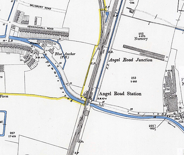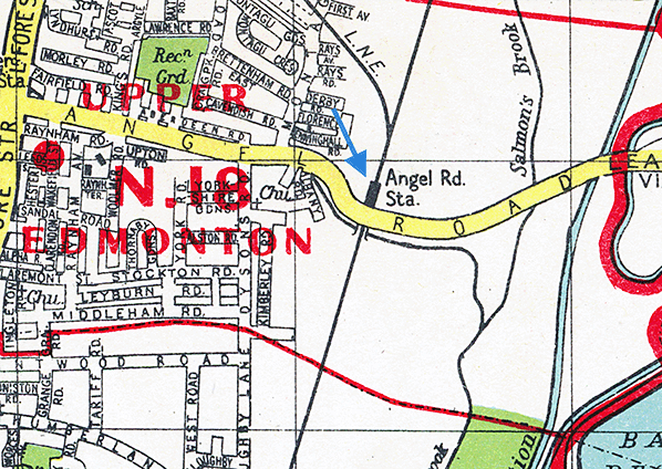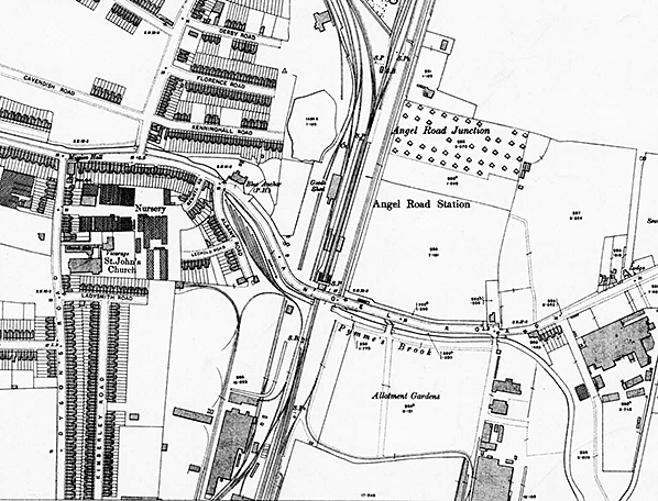 Notes: Angel Road was called Watery Lane in 1557 and Marsh Lane in the late 16th century, taking its present name in the 1870s from the inn standing at the corner of Fore Street. The opening of the station in 1840 was too early to bring suburbanisation to the vicinity as Londoners were not at that time prepared to countenance living so far from their place of work, partly because fares were high and services slow.