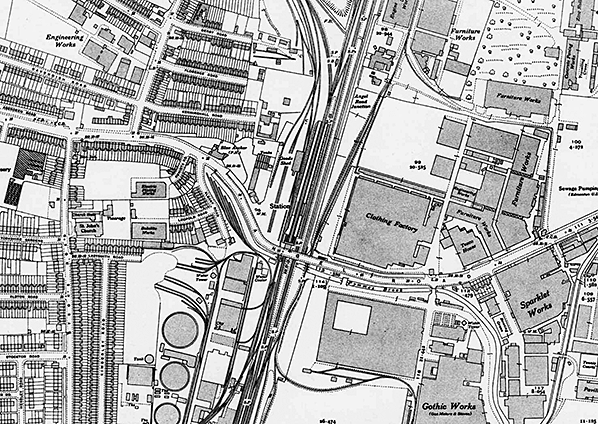 In 1909 the level crossing was replaced by a bridge and all the buildings, including the station house were demolished and replaced by brick waiting rooms and toilets with canopies on both platforms. The building on the down side was longer than the up side building. By this time, terraced housing was spreading outwards from the western part of Angel Road, helped by improvements in bus services and later by the introduction of trams. A new entrance building with a pitched roof was provided on the north side of the bridge with steps down to the two platforms. The building had a bus lay-by but the station had no parking facilities. A third siding has been added on the down side with one siding running through a new larger goods shed. A 3-ton capacity crane was provided in the yard in 1896. To the south of the station, the original goods shed has been demolished. There is a new siding on the up side running up to Angel Road and from this another siding curves to the east running into the Gothic Works (making gas metres and stoves). The gas works on the down side now has a substantial network of internal sidings. The Railway Clearing House Handbook for 1904 lists private sidings for Glover & Mains, London Fireproof Wall Co, Martin & Co, Staceys and the Tottenham & Edmonton Gas Co.
