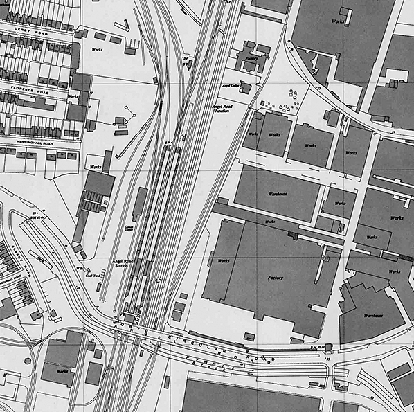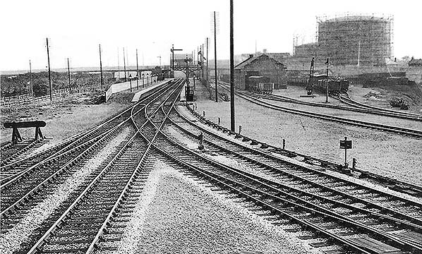 The 1896 OS map reproduced below clearly shows two platforms spanned by a footbridge immediately north of the level crossing; the up platform is a little longer than the down. Buildings and platform canopies are shown on both sides with the buildings on the down side incorporating the stationmaster's house. There are two sidings on the down side running behind the down platform. To the south of the station the gas works now has a small network of sidings accessed from two wagon turntables on the gas works siding. By this time there was some residential development to the west of the stations with a number of new roads being laid out.