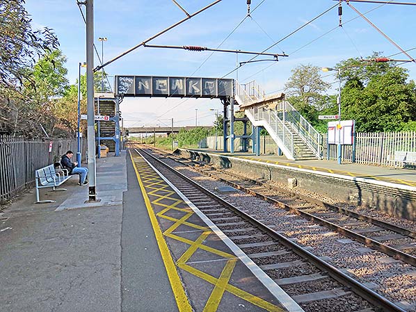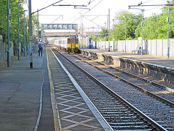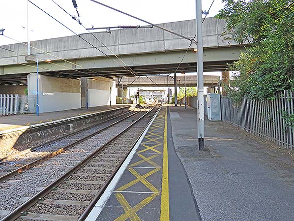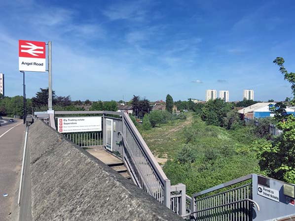 Photo by Nick Catford ![]() Looking south along the down platform at Angel Road on 31 May 2019. Meridian Water station is seen beyond the bridges. The first viaduct is the North Circular Road and beyond an off slip from the road.
