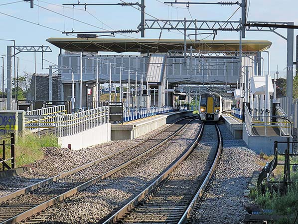 Photo by Nick Catford ![]() A class 379 Electrostar EMU 379015 hauls the Stansted Express north through the unopened Meridian Water station in May 2019. This view is from the down platform at Angel Road.