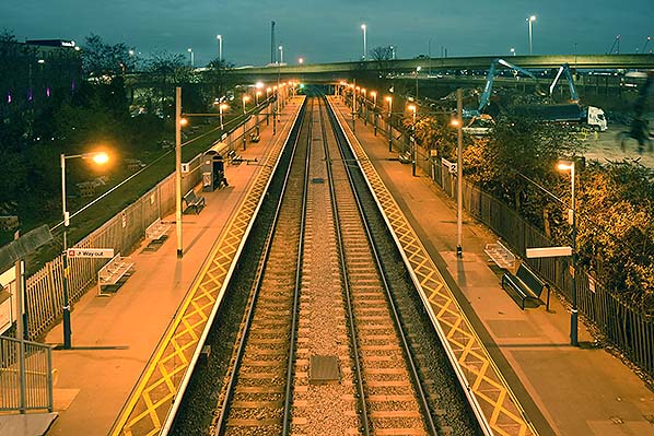 ![]() Night view of Angel Road station looking south in December 2017 from the station footbridge. Lights and station furniture has changed again as the line is now under the control of Greater Anglia.