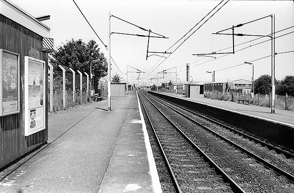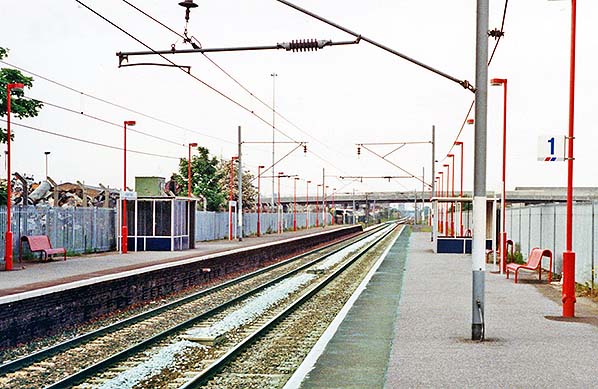 ![]() Angel Road station looking north along the down platform in July 1987 before Conduit Lane was built. Conduit Lane would straddle the line to the north of the station giving road access to Meridian Way. The entrance to the station would eventually be relocated to Conduit Lane.
