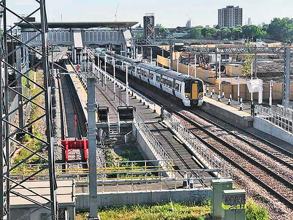 Photo by Greg Kitson ![]() A class 379 Electrostar EMU hauls the Stansted Express north through the unfinished Meridian Water station in May 2019. This view is from North Circular off slip road. On the left is a bay platform in September it is planned to introduce a 30 minute shuttle between Stratford and Meridian Water.