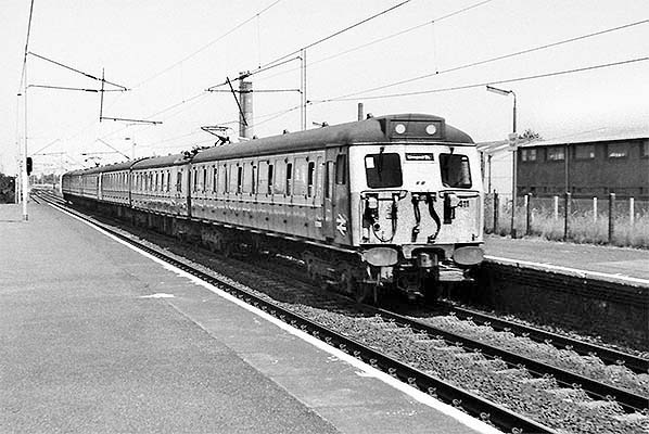 Photo by John Attfield ![]() In July 1987 a Hertford East - Liverpool Street service is seen at Angel Road. What can be seen of the station's environs gives a hint of the somewhat bleak and inhospitable location in which this station stood, the large industries which once abounded having long since given way to a mix of smaller industrial units and desolation. Behind the platform on the right once ran two goods loops. The train is formed of a pair of 3-car Class 305/1 EMUs, that leading being No.305 411. The type began life in 1959 in 4-car form with First and Second Class accommodation, with the 3-car Second Class only version appearing in 1960. The type, mounted on Gresley bogies, was originally designated AM5 (AC Multiple-unit Type 5); type AM1 had been the Lancaster - Morecambe - Heysham units and AM11 the original Glasgow area units. Designation AM12 had been intended for what emerged as Class 312. The AM5s were inner suburban units and dominated the Chingford and Enfield lines. They were also a common sight on Hertford East services and would also turn up at Bishop's Stortford and, in their later years operating in the south-east, Cambridge. Replacement came in the form of Class 315 and Class 317, following which Class 305 was disbanded, for a time, to other areas of the country before final withdrawal in 2001. None have survived into preservation.