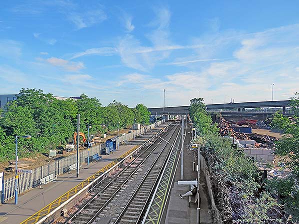 Looking south from the footbridge at Angel Road station on 31 May 2019. The site of the station goods yard is seen on the right and to the left the site of the goods lines that ran behind the up platform. The tracks here are due to be reinstated.