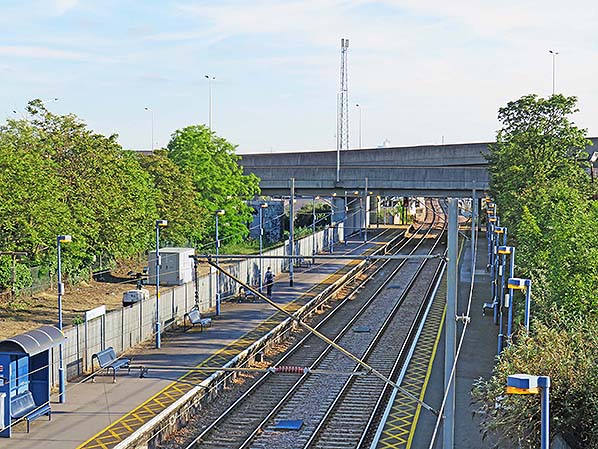 Looking south from the footbridge at Angel Road station on 31 May 2019. The site of the goods lines that ran behind the up platform is seen on the left. The tracks here are due to be reinstated.