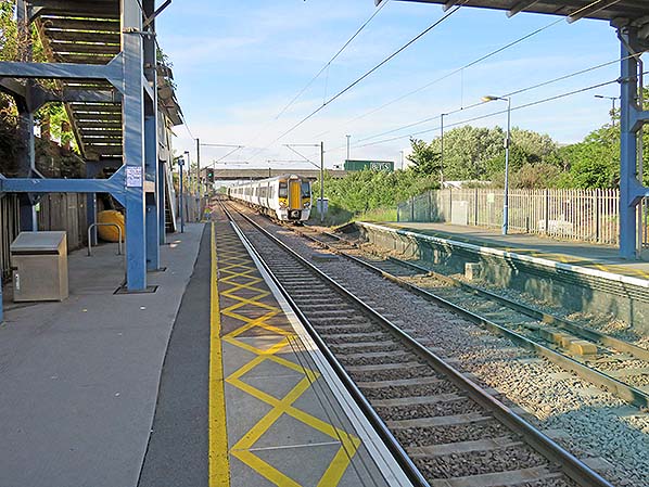 ![]() Looking north from the down platform at Angel Road station on 31 May 2019, the last day of public service. Class 379 Electrostar EMU 379015 hauls the Stansted Express north through the station.