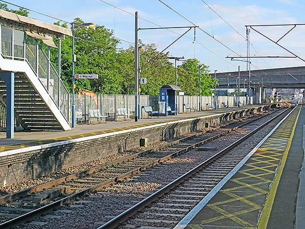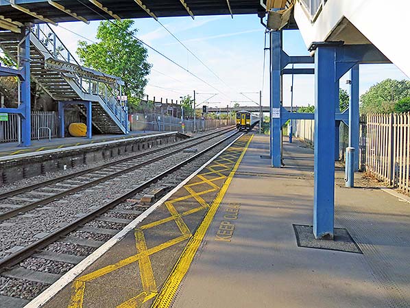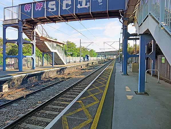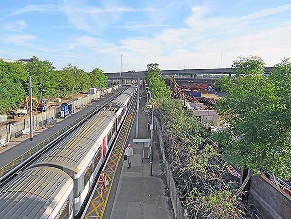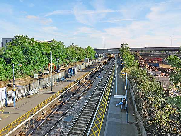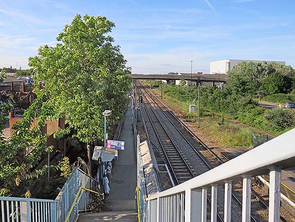 Photo by Nick Catford ![]() Looking north from the Angel Road footbridge on 31 May 2019. The footpath leads to the station entrance on the north side of Conduit Lane; the bridge seen in the background.