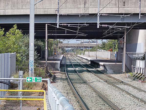 Photo by Nick Catford ![]() ![]() ![]() Looking south from the footbridge at Angel Road station on 31 May 2019. The site of the station goods yard is seen on the right and to the left the site of the goods lines that ran behind the up platform. The tracks here are due to be reinstated.