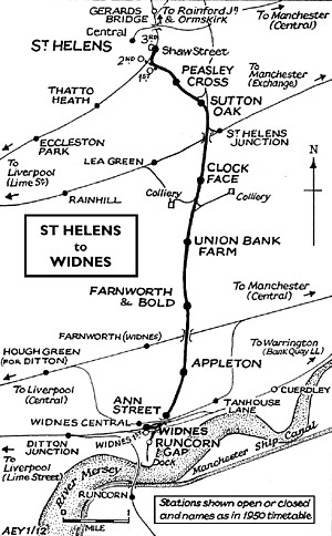 Ann Street, Farnworth & Bold, Union Bank Farm Halt, Clock Face, Sutton Oak, Peasley Cross, St Helens 1st, St Helens 2nd &
