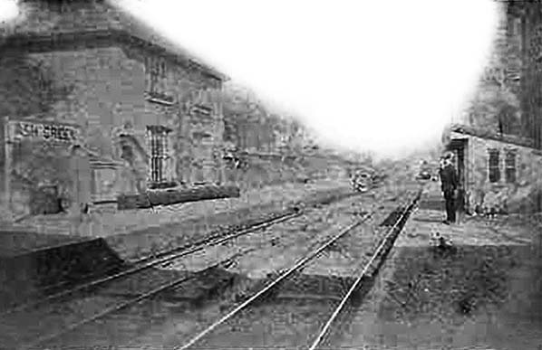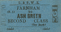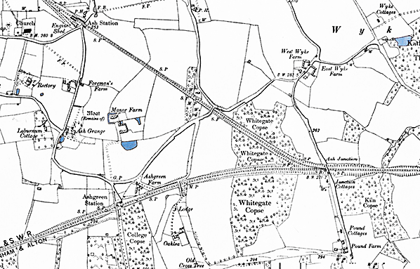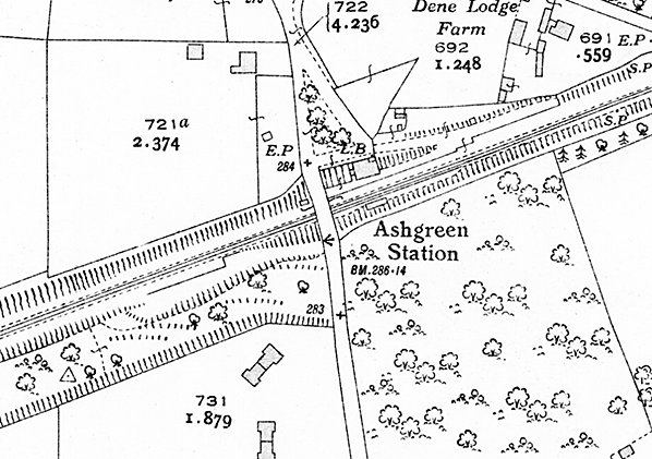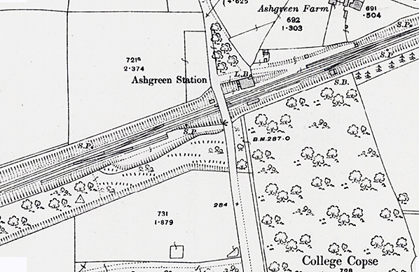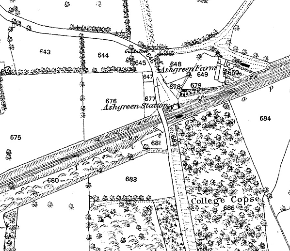 Notes: Ash Green station opened with the line and was provided with two short facing platforms faced with brick. The station was sited in a cutting and the main two-storey building was at the rear of the up platform; the booking office and waiting room were on the lower floor while the upper floor was accommodation for the stationmaster. An external covered stairway took passengers down to the platform with a door into the booking office at the bottom of the steps. The building was of brick construction with a hipped slate roof and a gabled porch on the upper floor fronting onto a small forecourt. The down platform was provided with a timber waiting shelter with a plain upward-sloping roof projecting over the platform as a narrow canopy. Passengers crossed the line using a timbered crossing at the bottom of the stairs. The station was originally called Ash but was renamed Ash Green in December 1876. It reverted to Ash in September 1891 once again becoming Ash Green on 1 October 1895.