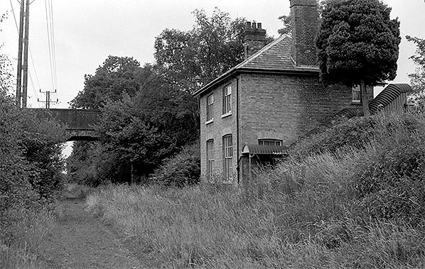 ![]() Ash Green Halt looking west towards Tongham in July 1975. The window opening at the bottom of the stairs originally accommodated double-doors into the booking office.