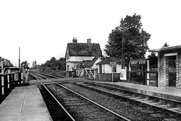Along with the other rail-motor halts on the Bedford - Bletchley line, during WW1 Aspley Guise closed on 1 January 1917 as an economy measure; it reopened on 5 May 1919. During LMS days the wooden sleepers of the original platform were replaced with concrete paving. The LMS also provided a brick waiting shelter with a flat concrete roof on the down platform.