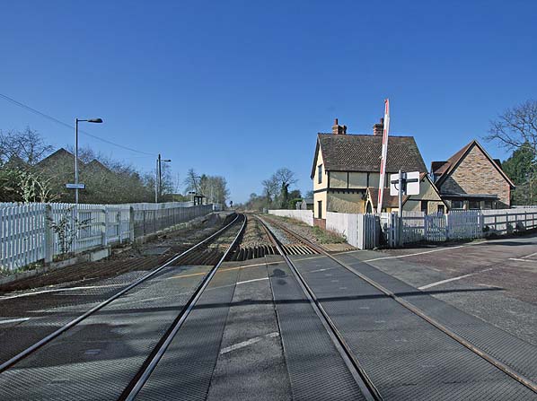 Aspley Guise station looking west from Station Road level crossing in February 2014.