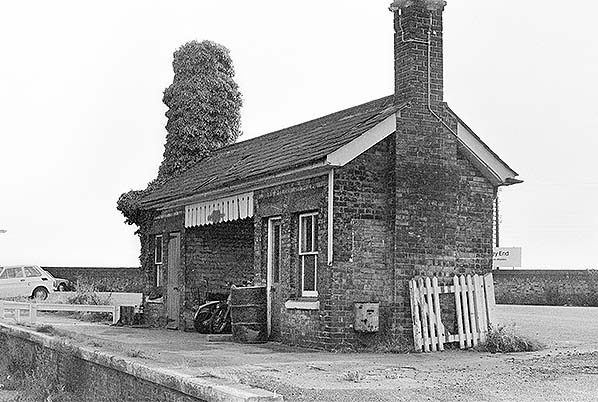 Six years after the track was lifted from most of the branch, this is Audley End branch platform in 1974. Both chimneys on the platform building were still present at this time, one being in use as a foothold for some ivy. The fence at the rear of the platform has gone (the existence of which was rather pointless) and crash barrier type structure has appeared at the platform edge as the area has become an extension to the station car park. The position of the totem sign is clearly visible on the valance in front of the shelter.
