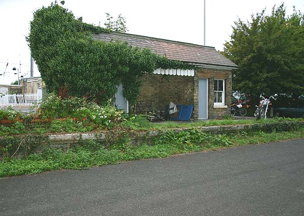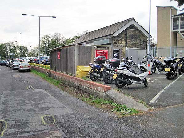 Copyright photo by Nigel Mundy ![]() Audley End branch platform in September 2005. The chimneys have gone, a tree is growing at the north end of the building and the trackbed has been raised by the addition of a tarmac surface for car parking. The tree, photographic evidence suggests, had been there for a very long time and was pruned back from time to time. On the far left, the overhead wires of the main line are visible. Of the two rooms which flanked the waiting shelter, one was a store and the other an office but it is unclear which was which and plans do not differentiate. Nevertheless, one would appear to be becoming unusable due to encroaching greenery while the other is obviously well maintained and possibly still in use for one purpose or another. Given that parking space is at a premium at commuter stations, it is perhaps surprising that the branch platform and its building continue to survive as of 2015. The reason may lay in the fact that the trackbed of the Saffron Walden branch was at a lower level than the main station forecourt behind it. The waiting shelter is today used for parking motorcycles so perhaps that is the reason for its survival.